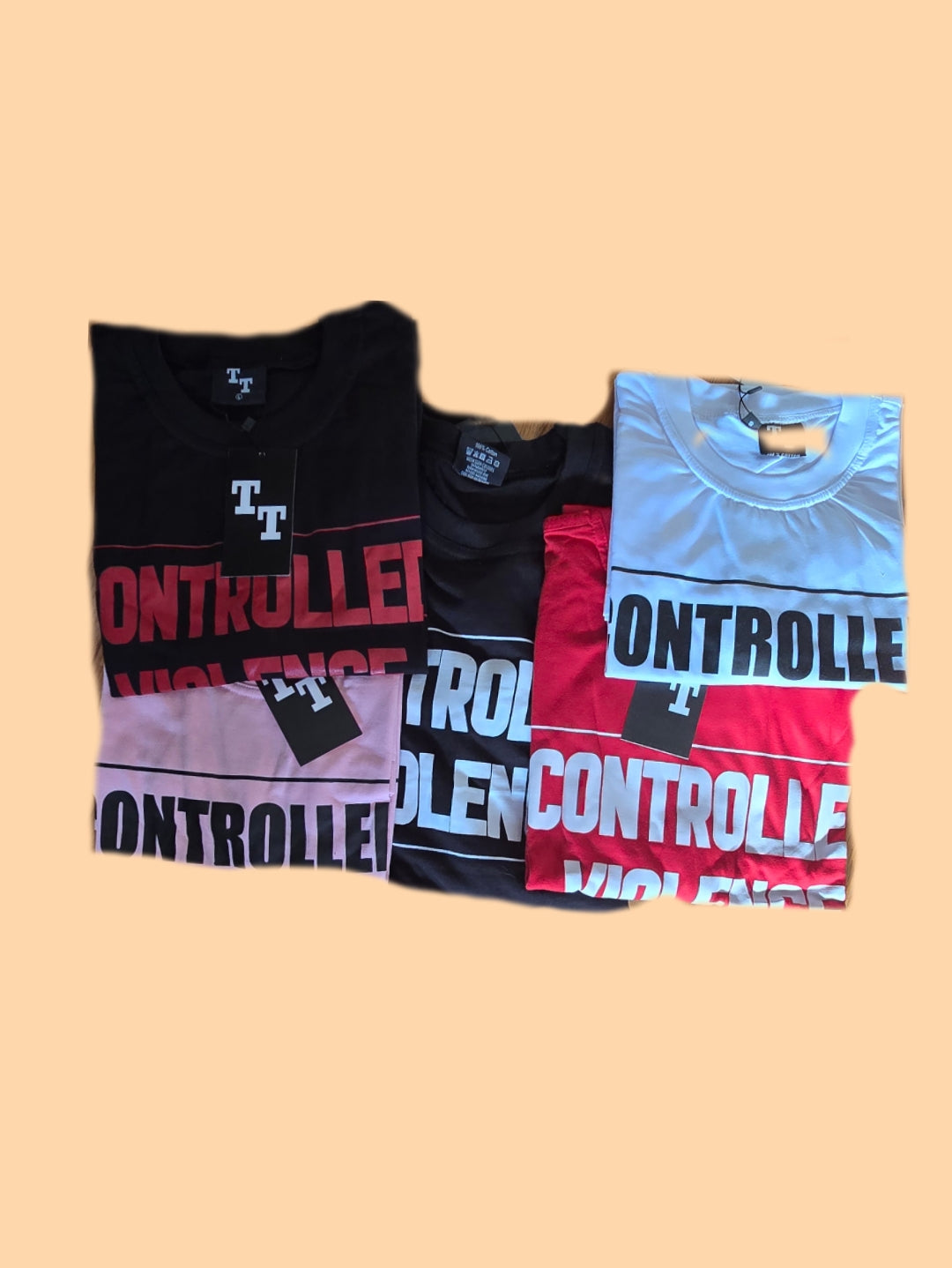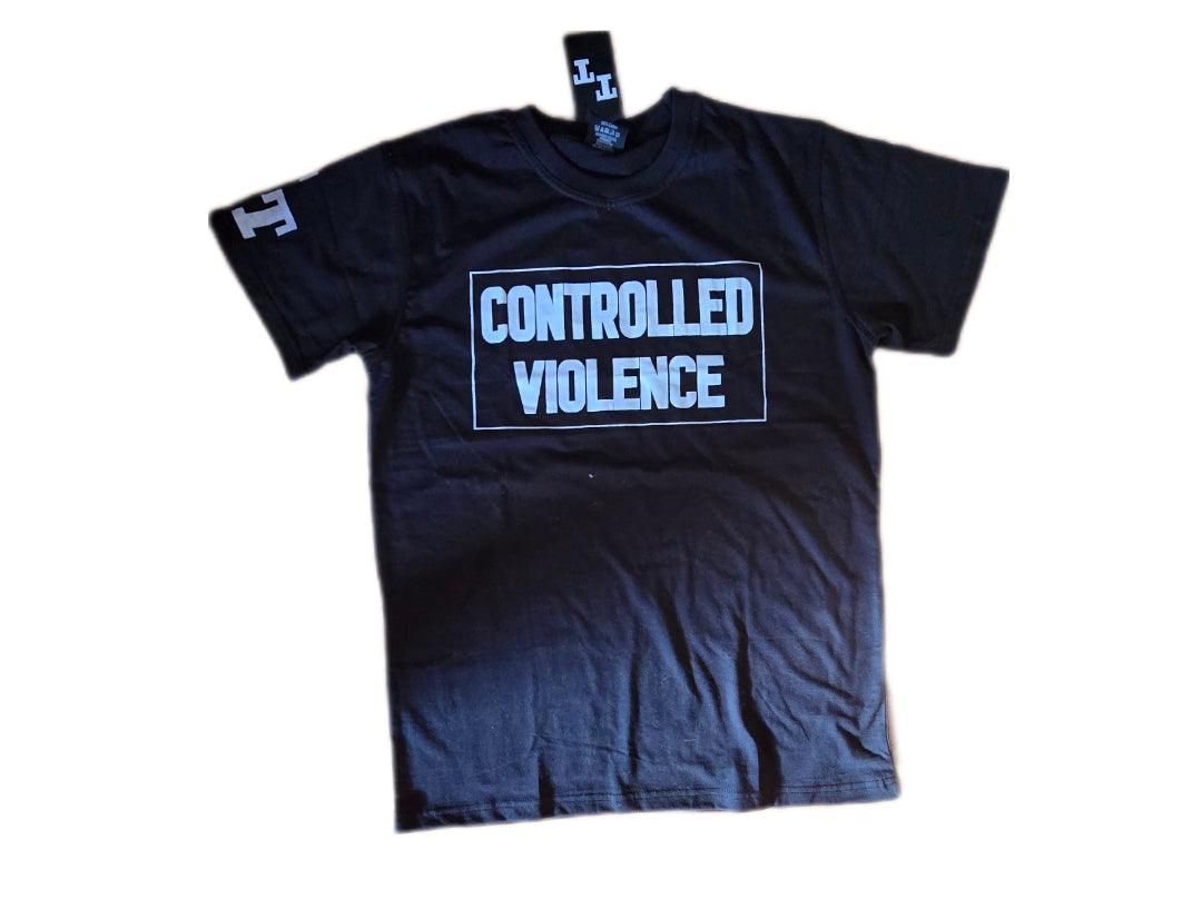 Black Tshirt with White CONTROLLED VIOLENCE in front and Japanese Teep Territory in Back/TT on sleeve